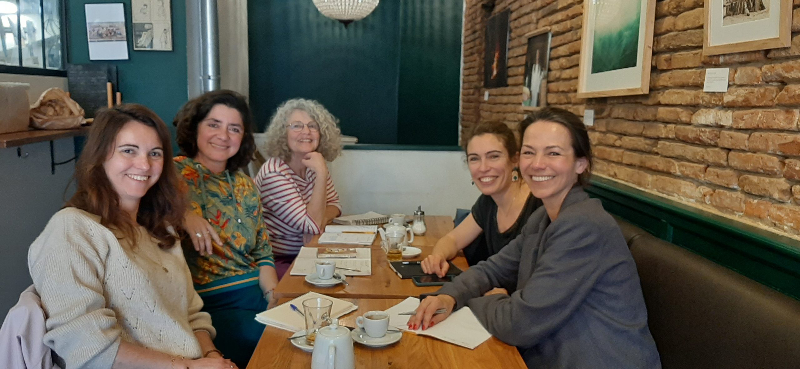 Collectif Avant Les Mots : association d’animatrices d’ateliers d’écriture. Nous proposons des animations concoctées en groupe. De gauche à droite : Malie Daubiné, Elise Vandel, Marianne Lamor, Adèle Naudy, Albane Froissart.