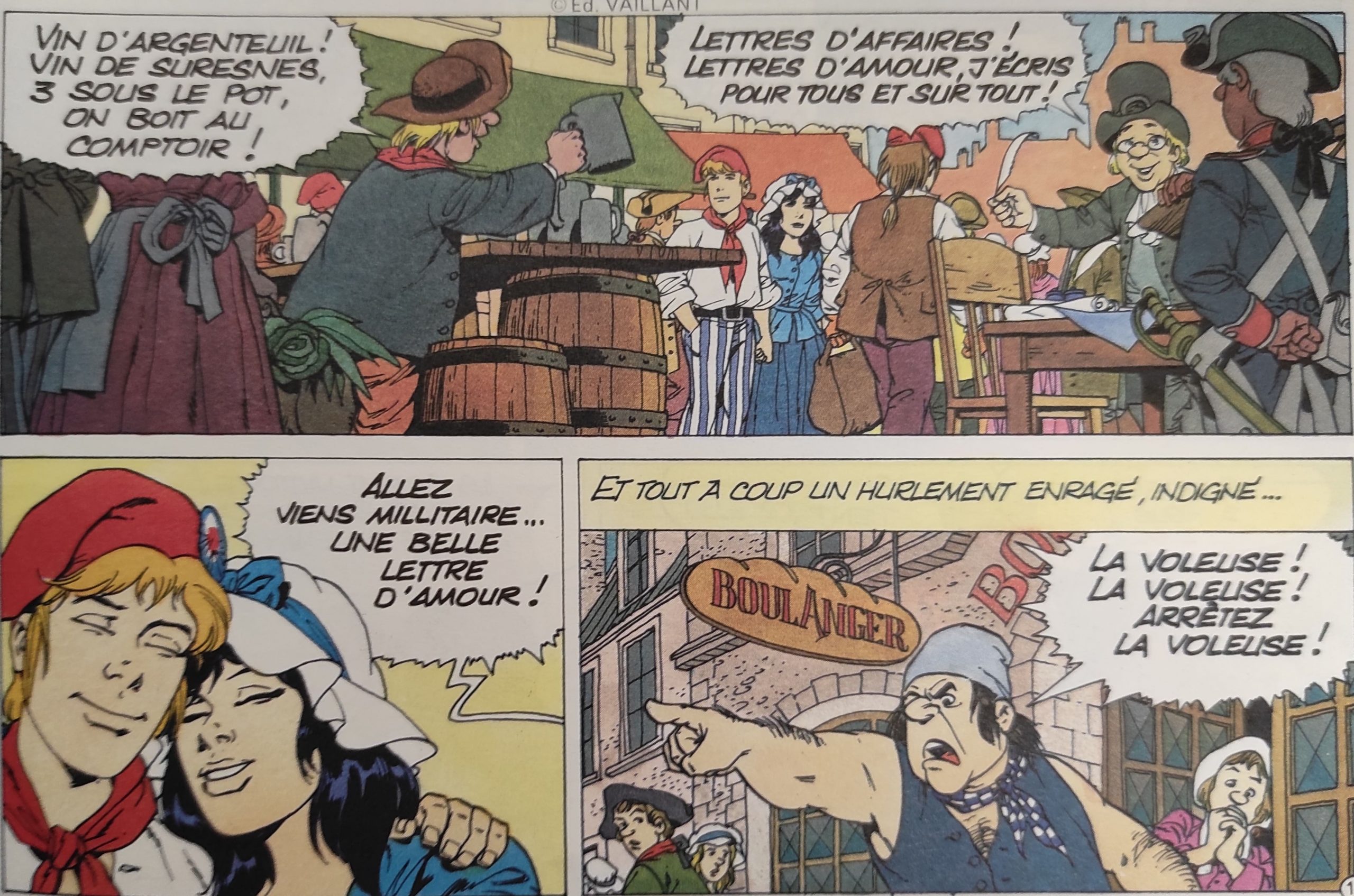L’explication se trouve dans deux cases d’une BD, « Noël et Marie » (éditions Messidor/La Farandole, Tome 2, 1989), qui narre les aventures de deux adolescents sous la Révolution française. Dans un arrière-plan, un écrivain public interpelle le public en proposant à qui le voudrait l’écriture de lettres d’affaires ou de lettres d’amour. « Waouh, on peut écrire pour des gens ! » s’était exclamée – dans sa jeunesse – notre stagiaire de formation à la lecture de cette BD.